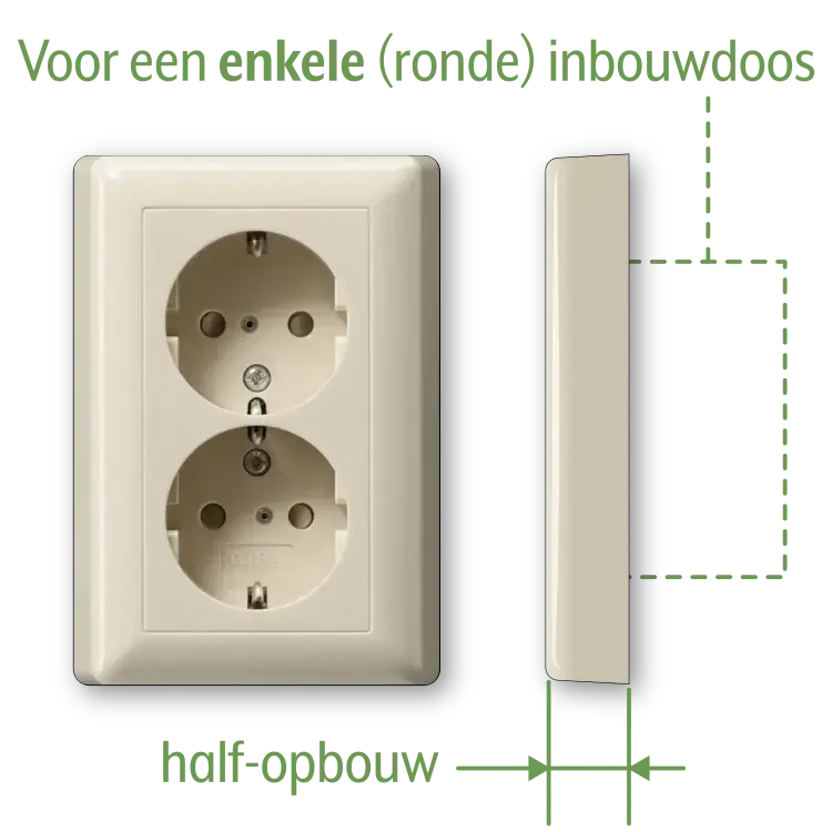 Dubbele wandcontactdoos met randaarde, geschikt voor een enkele (ronde) inbouwdoos. Zonder spreidklemmen (bevestigingsklauwen). Kleur: crème glans. Bedrading aansluiten met steekklemmen. Doordat deze dubbele wcd alleen geschikt is voor een enkele (ronde) inbouwdoos, ligt deze wat dikker op de muur. Dit wordt dan ook wel half-opbouw genoemd.