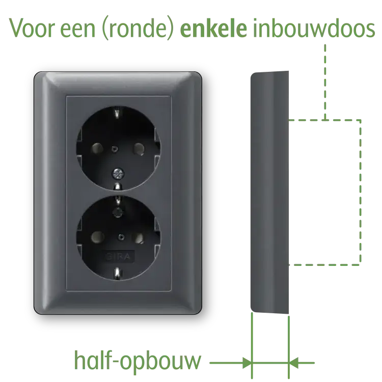 Dubbele wandcontactdoos met randaarde, geschikt voor een enkele (ronde) inbouwdoos. Zonder spreidklemmen (bevestigingsklauwen). Kleur: antraciet mat. Bedrading aansluiten met steekklemmen. Doordat deze dubbele wcd alleen geschikt is voor een enkele (ronde) inbouwdoos, ligt deze wat dikker op de muur. Dit wordt dan ook wel half-opbouw genoemd.