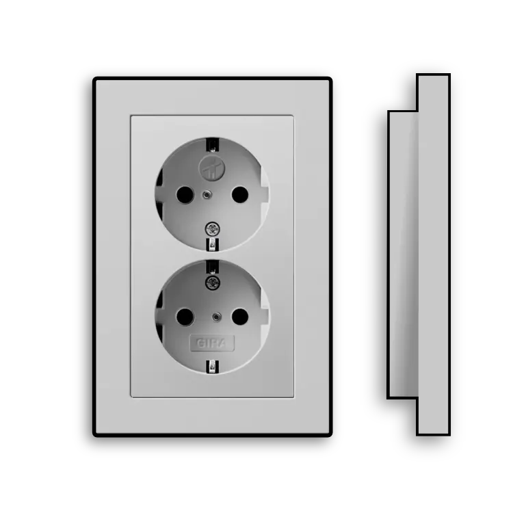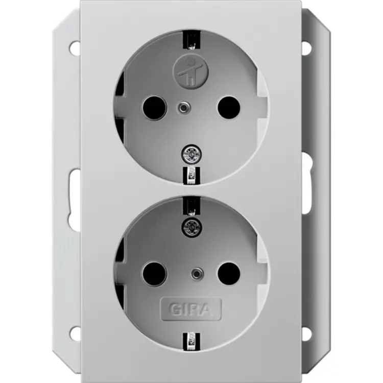 Dubbel stopcontact met randaarde en verhoogde aanraakbeveiliging, geschikt voor een enkele (ronde) inbouwdoos. Rondom afdekken met een 1,5-voudig afdekraam in de gewenste kleur/serie. Systeem 55, kleur: grijs mat. Meer informatie »