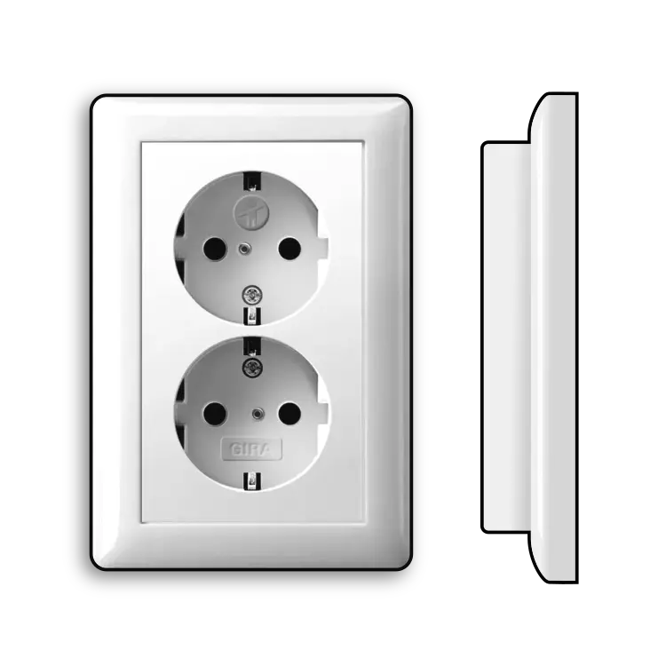 Dubbele stopcontact met randaarde en verhoogde aanraakbeveiliging, geschikt voor een enkele (ronde) inbouwdoos. Rondom afdekken met een 1,5-voudig afdekraam in de gewenste kleur/serie. Systeem 55, kleur: wit glans.