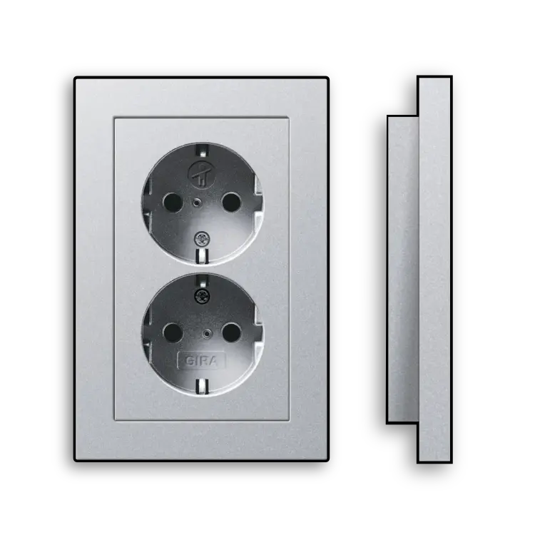 Dubbel stopcontact met randaarde en verhoogde aanraakbeveiliging, geschikt voor een enkele (ronde) inbouwdoos. Rondom afdekken met een 1,5-voudig afdekraam in de gewenste kleur/serie. Systeem 55, kleur: aluminium mat. Meer informatie »