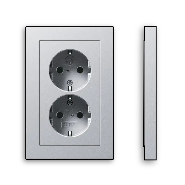 Dubbel stopcontact met randaarde en Safety+ (verhoogde aanraakbeveiliging), geschikt voor een anderhalve (ovale) inbouwdoos. Rondom afdekken met een 1,5-voudig afdekraam in de gewenste kleur/serie. Systeem 55, aluminium mat. Meer informatie »