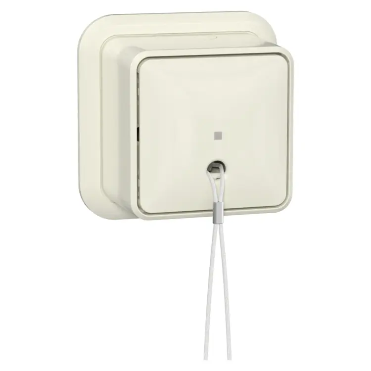 Opbouw trekschakelaar, 10A, IP20, crème. Te gebruiken in een 1-polige of een wisselschakeling. Wordt geleverd met montageplaat en adapter K/P25 (voor een kabelgoot).