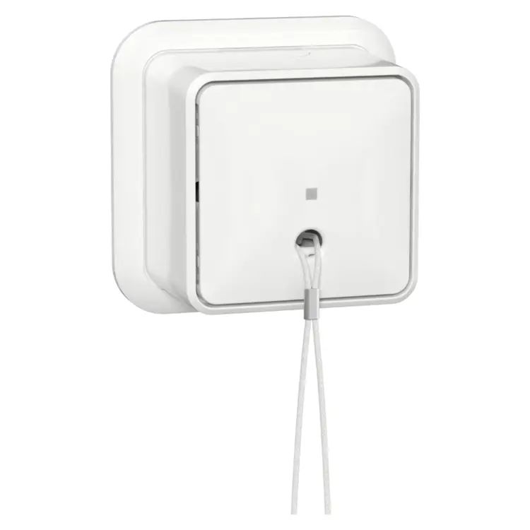 Opbouw trekschakelaar, 10A, IP20, wit. Te gebruiken in een 1-polige of een wisselschakeling. Wordt geleverd met montageplaat en adapter K/P25 (voor een kabelgoot).