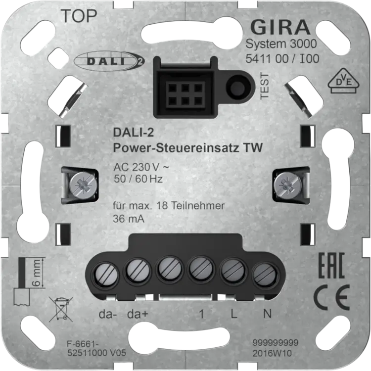 Het Gira System 3000 DALI-2 Power-besturingsbasiselement TW is een inbouwbasiselement voor het schakelen, dimmen en regelen van de kleurtemperatuur van DALI-verlichting. Het basiselement is ontworpen voor gebruik binnen het Gira System 3000 en maakt een comfortabele bediening van moderne DALI-armaturen mogelijk, inclusief Tunable White toepassingen.